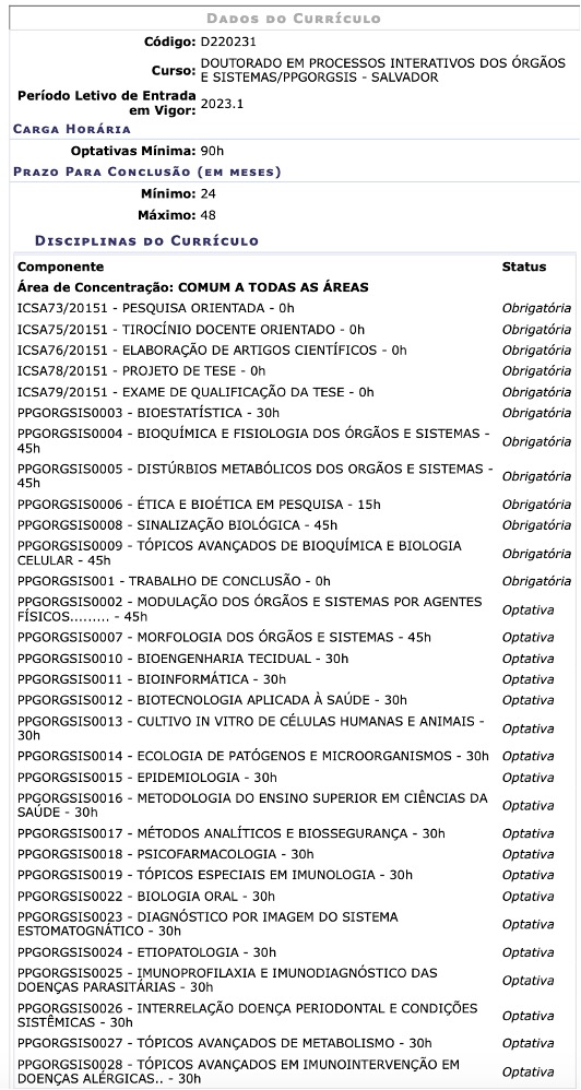 O aluno de Doutorado cursará as disciplinas obrigatórias e pelo menos três (3) disciplnas optativa.